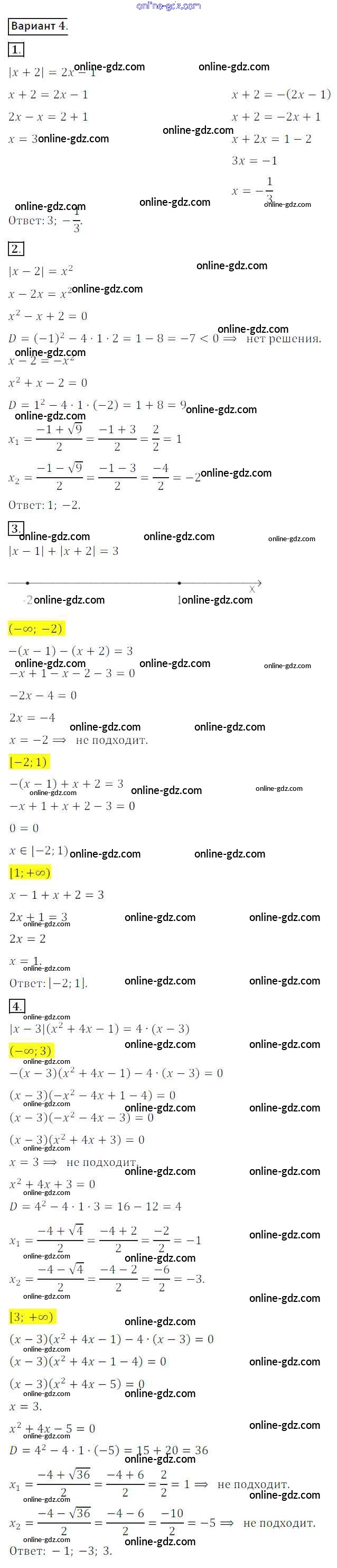 Готовые домашние задания по Алгебре за 8 класс Дидактические материалы Потапов, Шевкин МГУ - школе 2017 - СР №19. Уравнения, содержащие модули Самостоятельные работы вариант 4