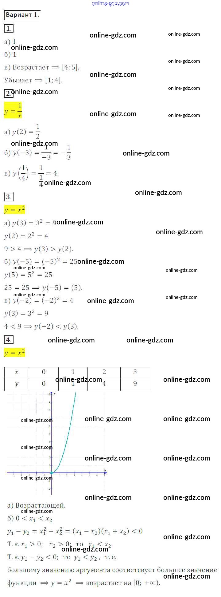 Готовые домашние задания по Алгебре за 8 класс Дидактические материалы Потапов, Шевкин МГУ - школе 2017 - СР №2. Функция. График функции Самостоятельные работы вариант 1