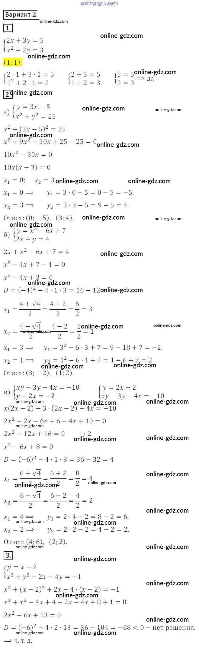 Готовые домашние задания по Алгебре за 8 класс Дидактические материалы Потапов, Шевкин МГУ - школе 2017 - СР №21. Системы уравнений первой и второй степени Самостоятельные работы вариант 2
