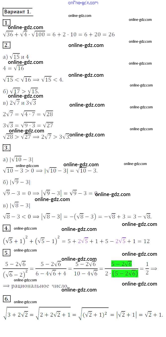 Готовые домашние задания по Алгебре за 8 класс Дидактические материалы Потапов, Шевкин МГУ - школе 2017 - СР №3. Квадратный корень из числа Самостоятельные работы вариант 1