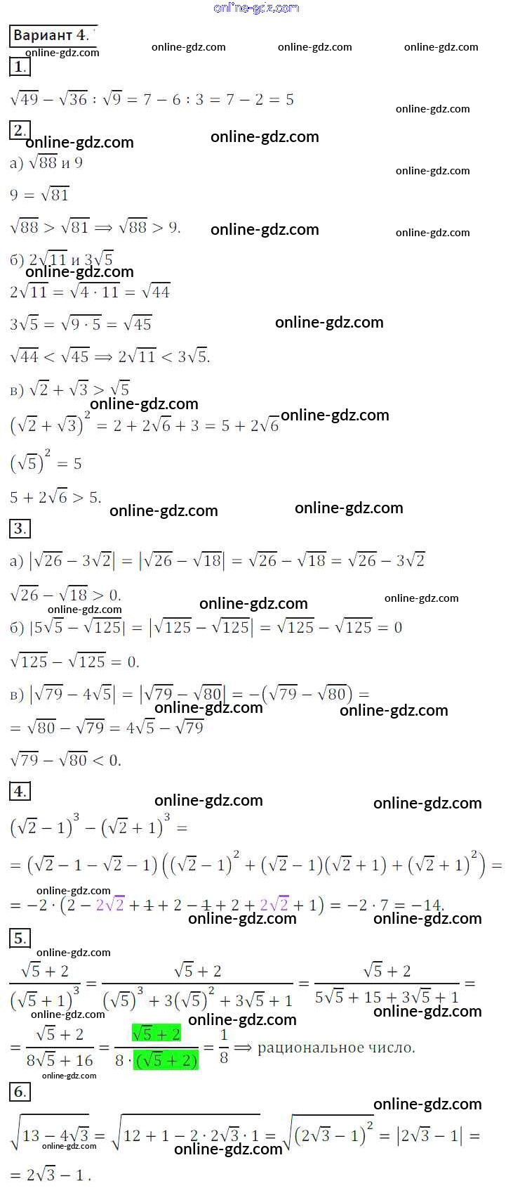Готовые домашние задания по Алгебре за 8 класс Дидактические материалы Потапов, Шевкин МГУ - школе 2017 - СР №3. Квадратный корень из числа Самостоятельные работы вариант 4