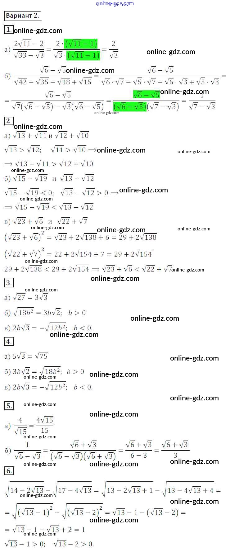 Готовые домашние задания по Алгебре за 8 класс Дидактические материалы Потапов, Шевкин МГУ - школе 2017 - СР №4. Преобразование выражений, содержащих квадратные корни Самостоятельные работы вариант 2