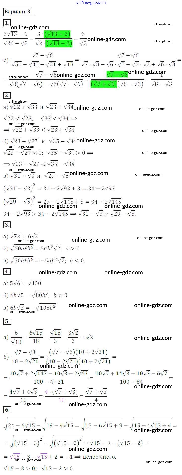 Готовые домашние задания по Алгебре за 8 класс Дидактические материалы Потапов, Шевкин МГУ - школе 2017 - СР №4. Преобразование выражений, содержащих квадратные корни Самостоятельные работы вариант 3