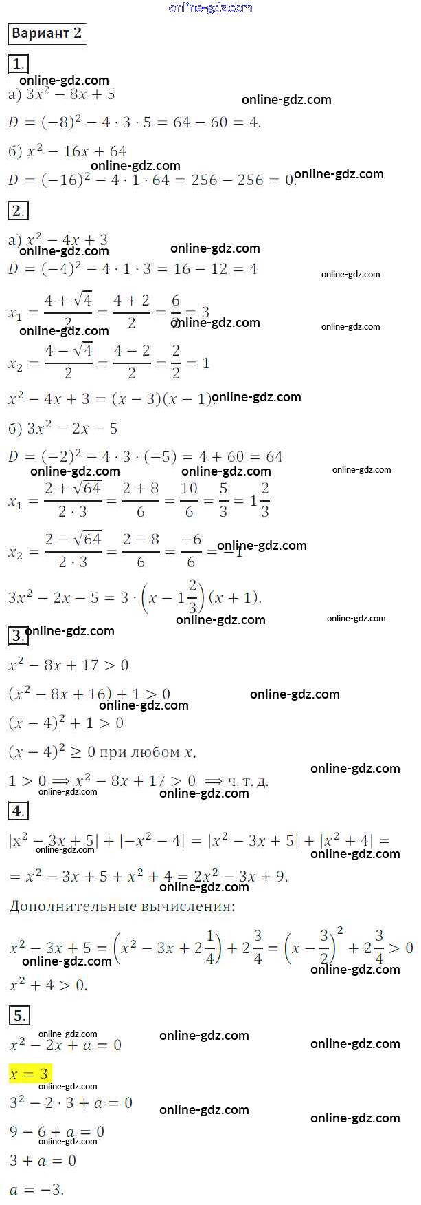 Готовые домашние задания по Алгебре за 8 класс Дидактические материалы Потапов, Шевкин МГУ - школе 2017 - СР №5. Квадратный трехчлен Самостоятельные работы вариант 2
