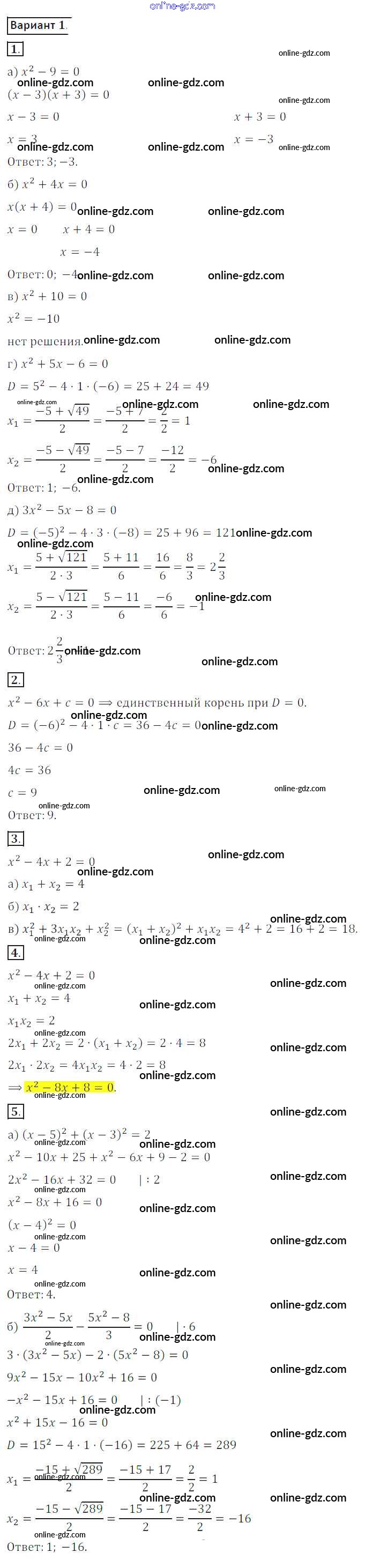 Готовые домашние задания по Алгебре за 8 класс Дидактические материалы Потапов, Шевкин МГУ - школе 2017 - СР №6. Квадратные уравнения Самостоятельные работы вариант 1