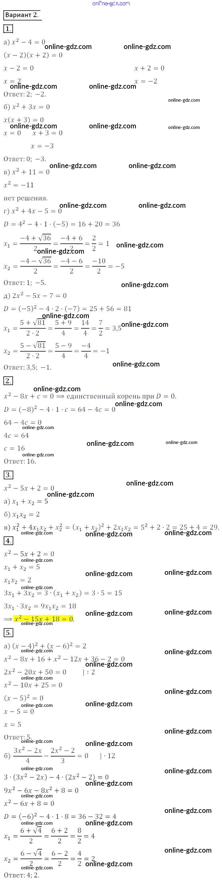 Готовые домашние задания по Алгебре за 8 класс Дидактические материалы Потапов, Шевкин МГУ - школе 2017 - СР №6. Квадратные уравнения Самостоятельные работы вариант 2