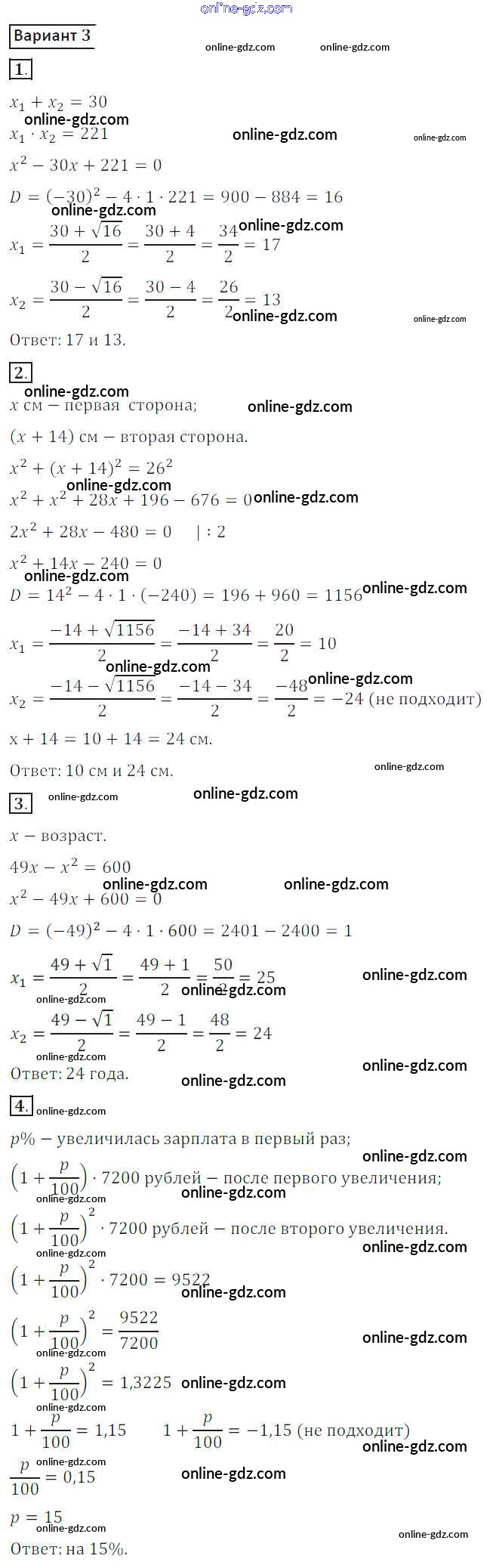 Готовые домашние задания по Алгебре за 8 класс Дидактические материалы Потапов, Шевкин МГУ - школе 2017 - СР №7. Решение задач при помощи квадратных уравнений Самостоятельные работы вариант 3