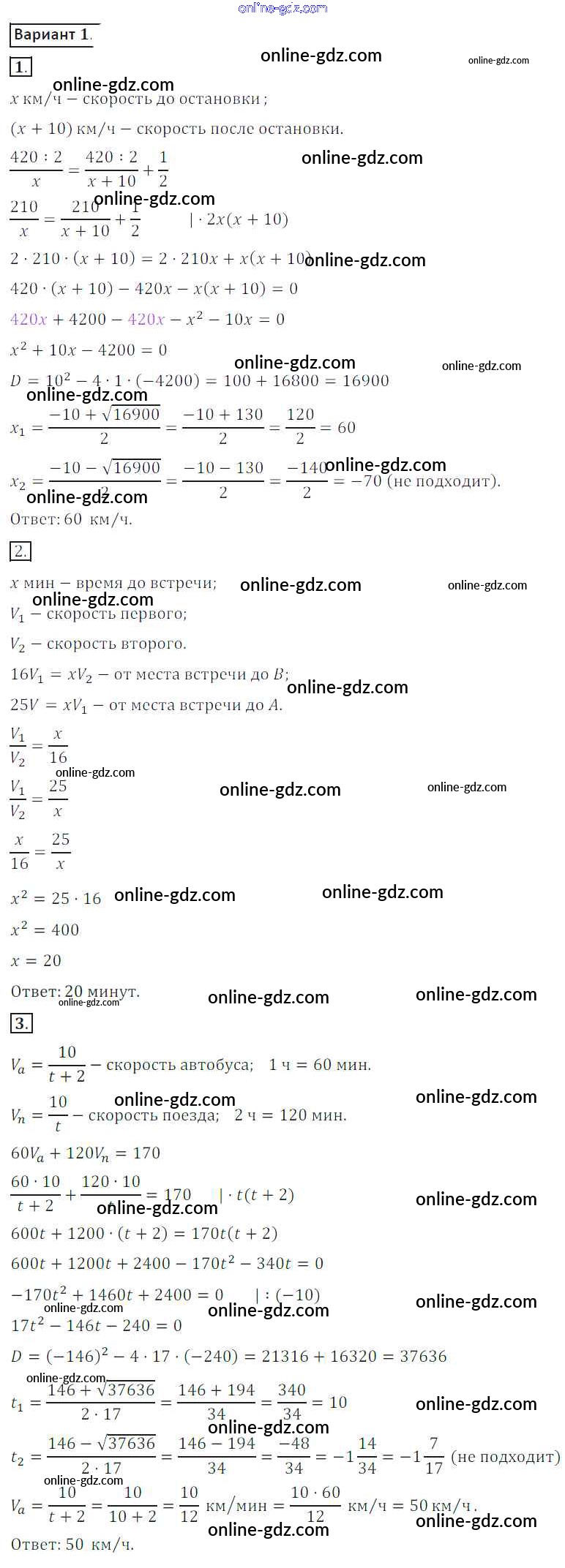 Готовые домашние задания по Алгебре за 8 класс Дидактические материалы Потапов, Шевкин МГУ - школе 2017 - СР №9. Решение задач при помощи рациональных уравнений Самостоятельные работы вариант 1