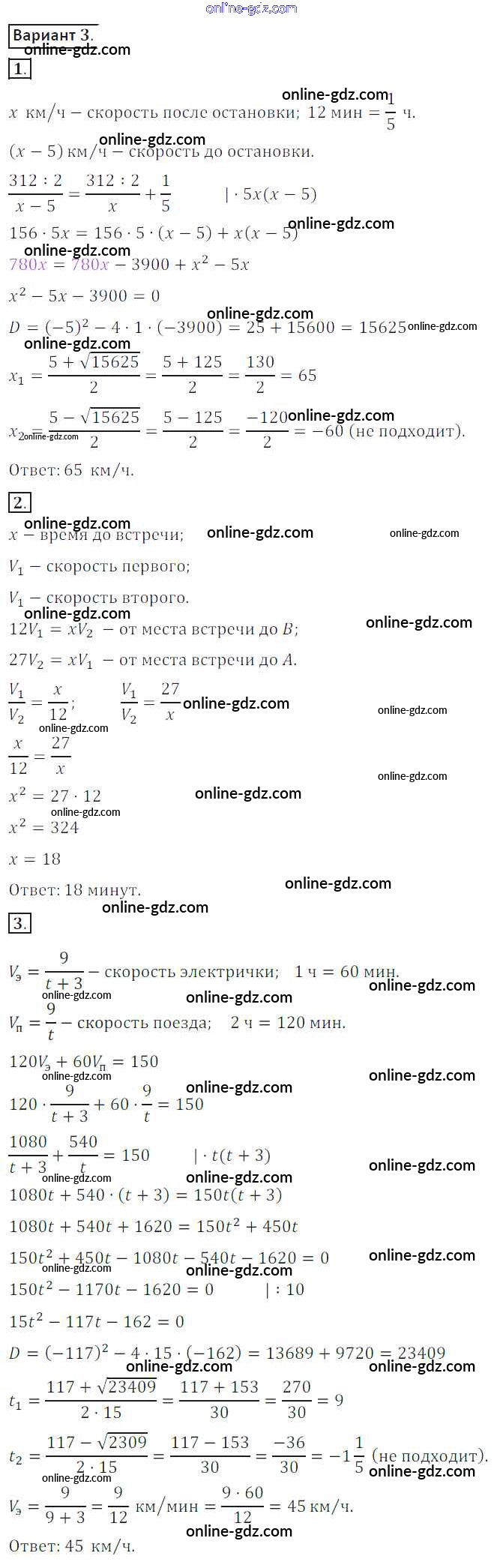 Готовые домашние задания по Алгебре за 8 класс Дидактические материалы Потапов, Шевкин МГУ - школе 2017 - СР №9. Решение задач при помощи рациональных уравнений Самостоятельные работы вариант 3