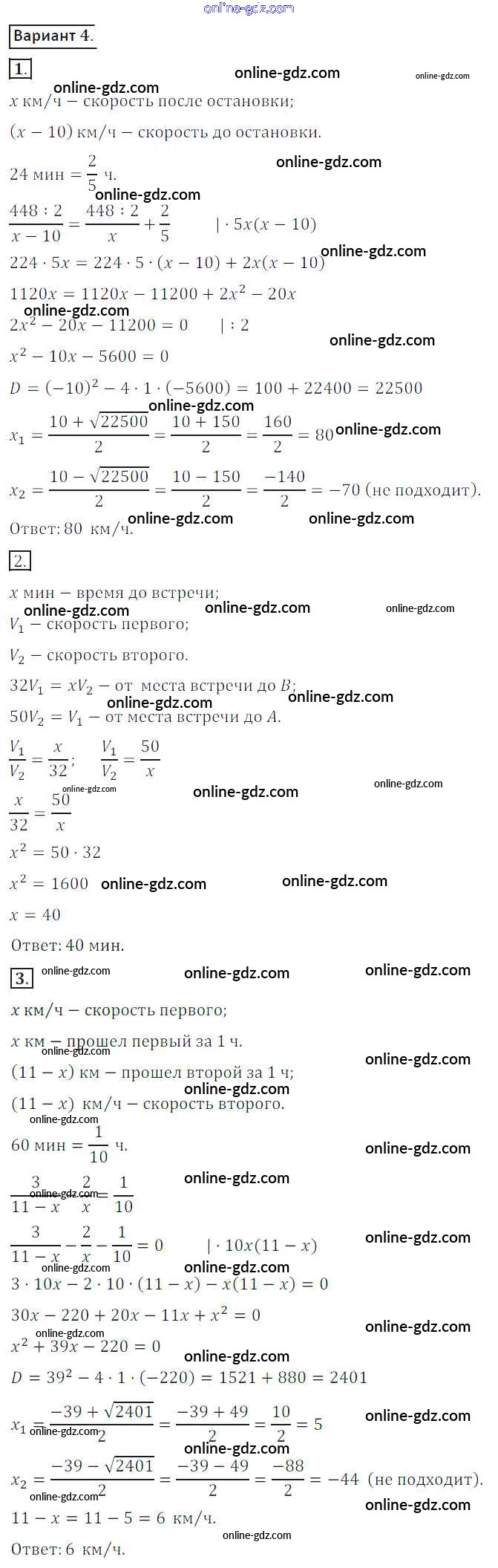Готовые домашние задания по Алгебре за 8 класс Дидактические материалы Потапов, Шевкин МГУ - школе 2017 - СР №9. Решение задач при помощи рациональных уравнений Самостоятельные работы вариант 4