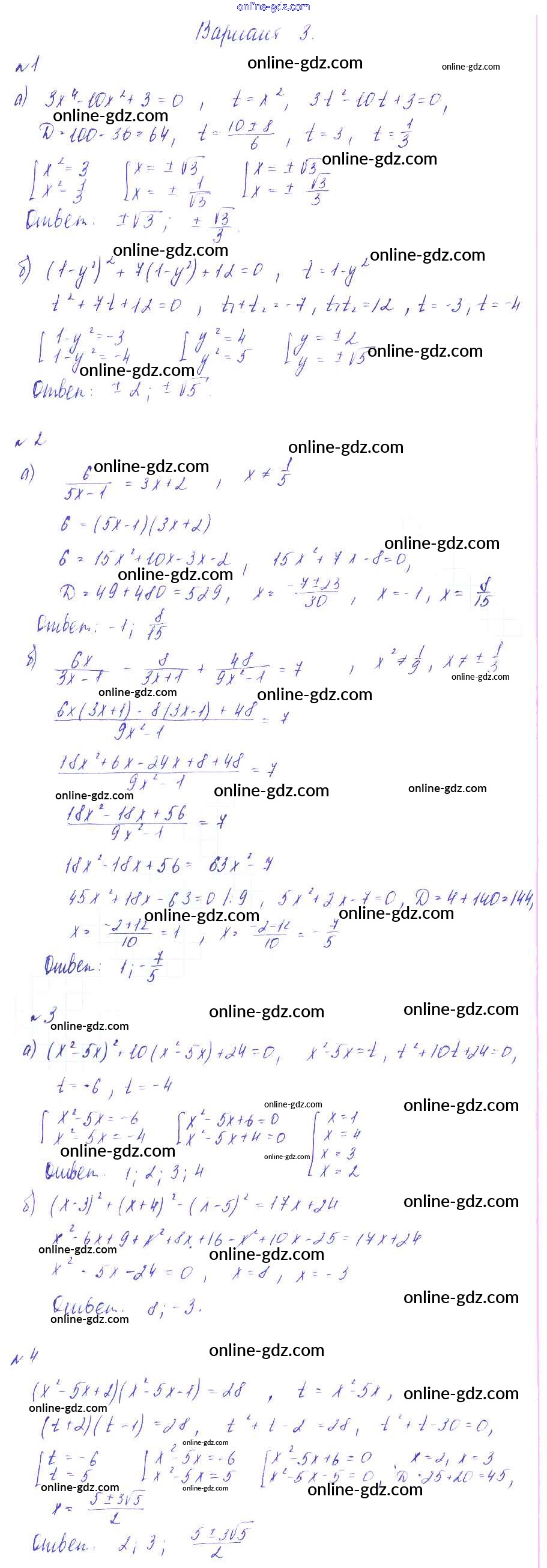 Готовые домашние задания по Алгебре за 8 класс Дидактические материалы Зив, Гольдич 2012 - СР №12. Уравнения, сводящиеся к квадратным Самостоятельные работы Вариант-3