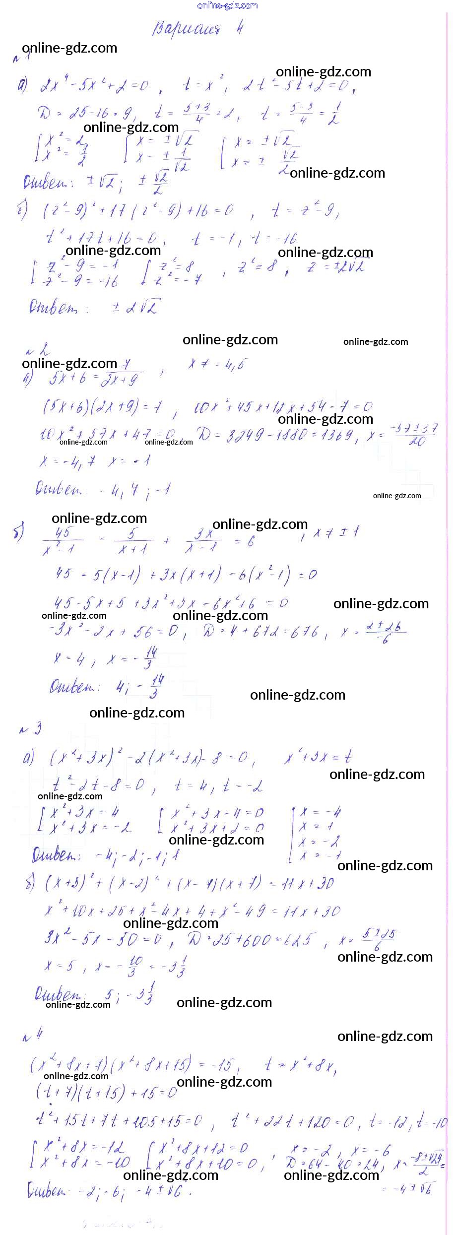 Готовые домашние задания по Алгебре за 8 класс Дидактические материалы Зив, Гольдич 2012 - СР №12. Уравнения, сводящиеся к квадратным Самостоятельные работы Вариант-4