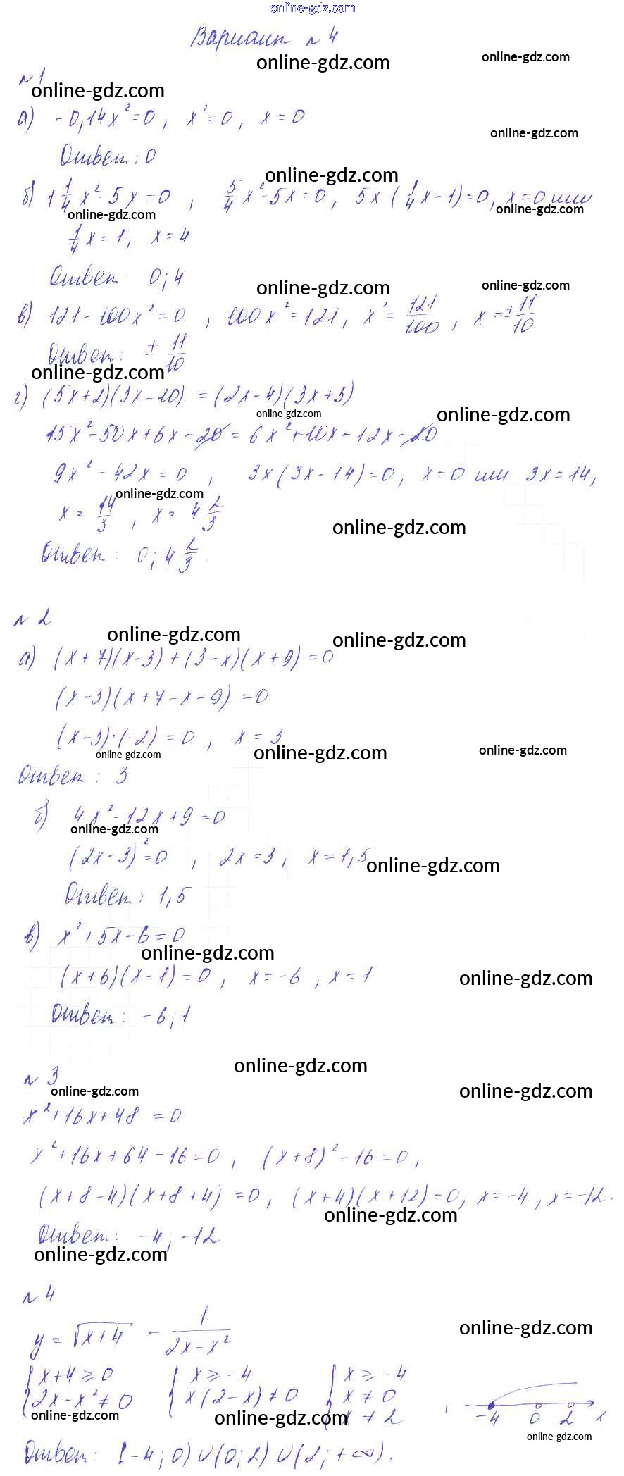 Готовые домашние задания по Алгебре за 8 класс Дидактические материалы Зив, Гольдич 2012 - СР №9. Неполные квадратные уравнения Самостоятельные работы Вариант-4