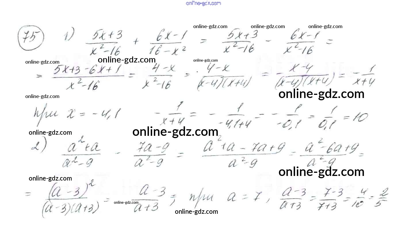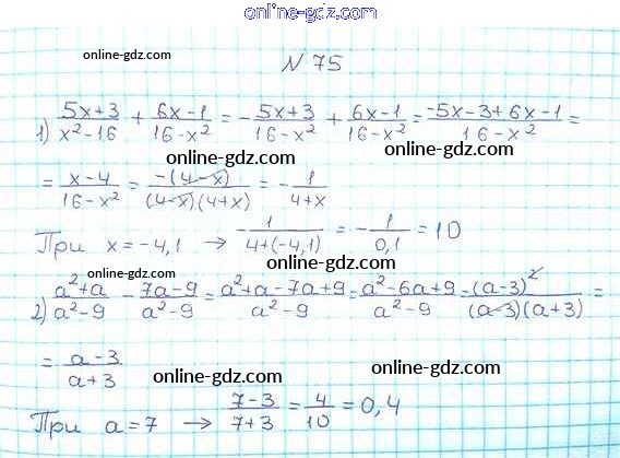 Готовые домашние задания по Алгебре за 8 класс Учебник Мерзляк, Полонский Алгоритм успеха 2016 - §3. Сложение и вычитание рациональных дробей с одинаковыми знаменателями Глава 1. Рациональные выражения 75