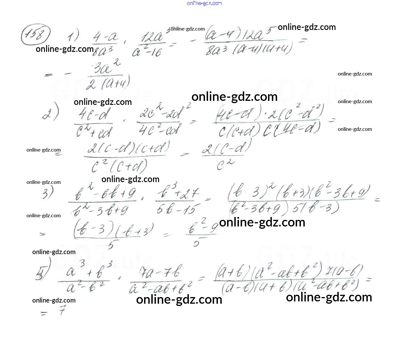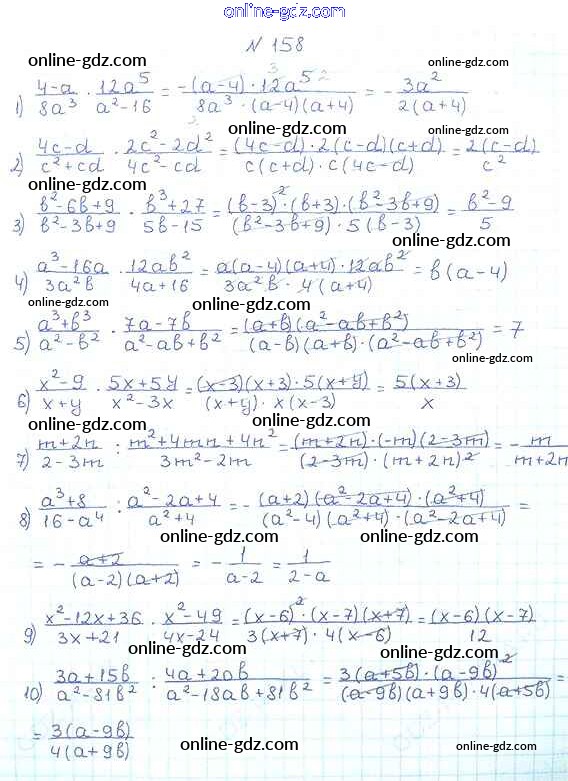 Готовые домашние задания по Алгебре за 8 класс Учебник Мерзляк, Полонский Алгоритм успеха 2016 - §5. Умножение и деление рациональных дробей. Возведение рациональной дроби в степень Глава 1. Рациональные выражения 158