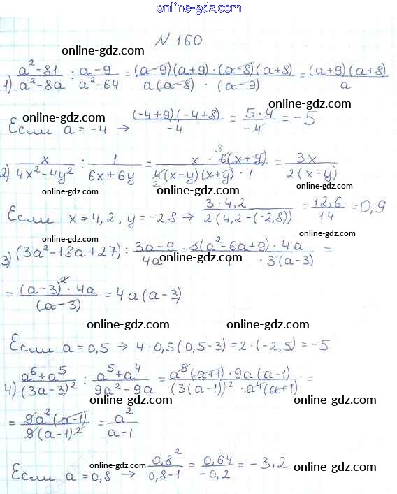 Готовые домашние задания по Алгебре за 8 класс Учебник Мерзляк, Полонский Алгоритм успеха 2016 - §5. Умножение и деление рациональных дробей. Возведение рациональной дроби в степень Глава 1. Рациональные выражения 160