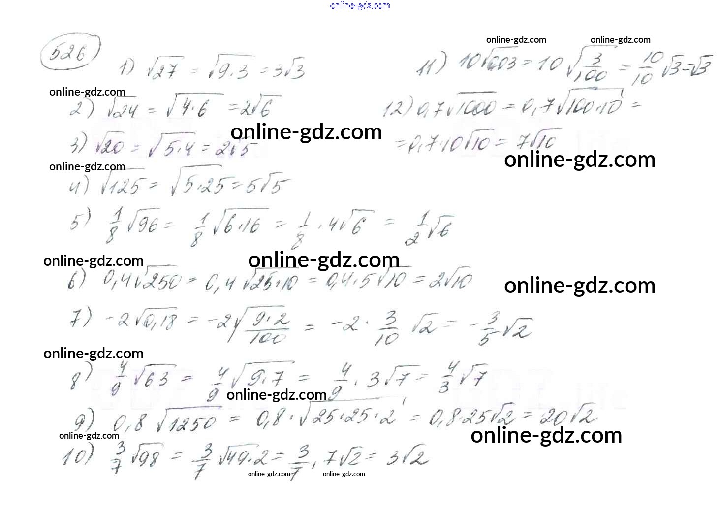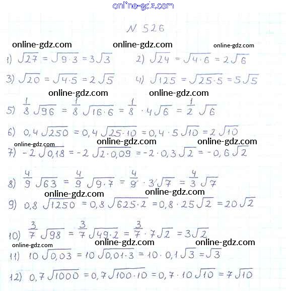 Готовые домашние задания по Алгебре за 8 класс Учебник Мерзляк, Полонский Алгоритм успеха 2016 - §17. Тождественные преобразования выражений, содержащих арифметические квадратные корни Глава 2. Квадратные корни. Действительные числа 526