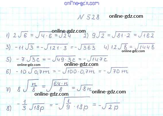 Готовые домашние задания по Алгебре за 8 класс Учебник Мерзляк, Полонский Алгоритм успеха 2016 - §17. Тождественные преобразования выражений, содержащих арифметические квадратные корни Глава 2. Квадратные корни. Действительные числа 528