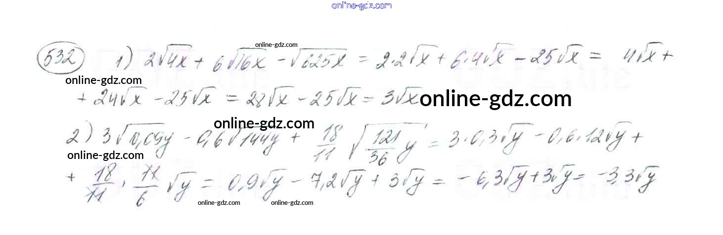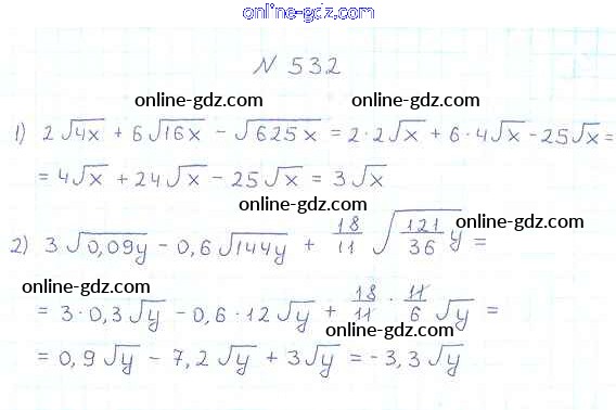 Готовые домашние задания по Алгебре за 8 класс Учебник Мерзляк, Полонский Алгоритм успеха 2016 - §17. Тождественные преобразования выражений, содержащих арифметические квадратные корни Глава 2. Квадратные корни. Действительные числа 532