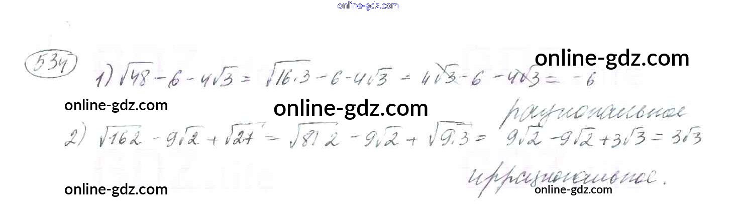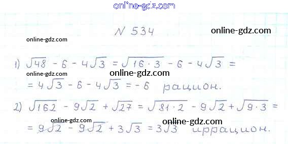 Готовые домашние задания по Алгебре за 8 класс Учебник Мерзляк, Полонский Алгоритм успеха 2016 - §17. Тождественные преобразования выражений, содержащих арифметические квадратные корни Глава 2. Квадратные корни. Действительные числа 534