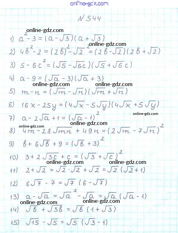 Готовые домашние задания по Алгебре за 8 класс Учебник Мерзляк, Полонский Алгоритм успеха 2016 - §17. Тождественные преобразования выражений, содержащих арифметические квадратные корни Глава 2. Квадратные корни. Действительные числа 544
