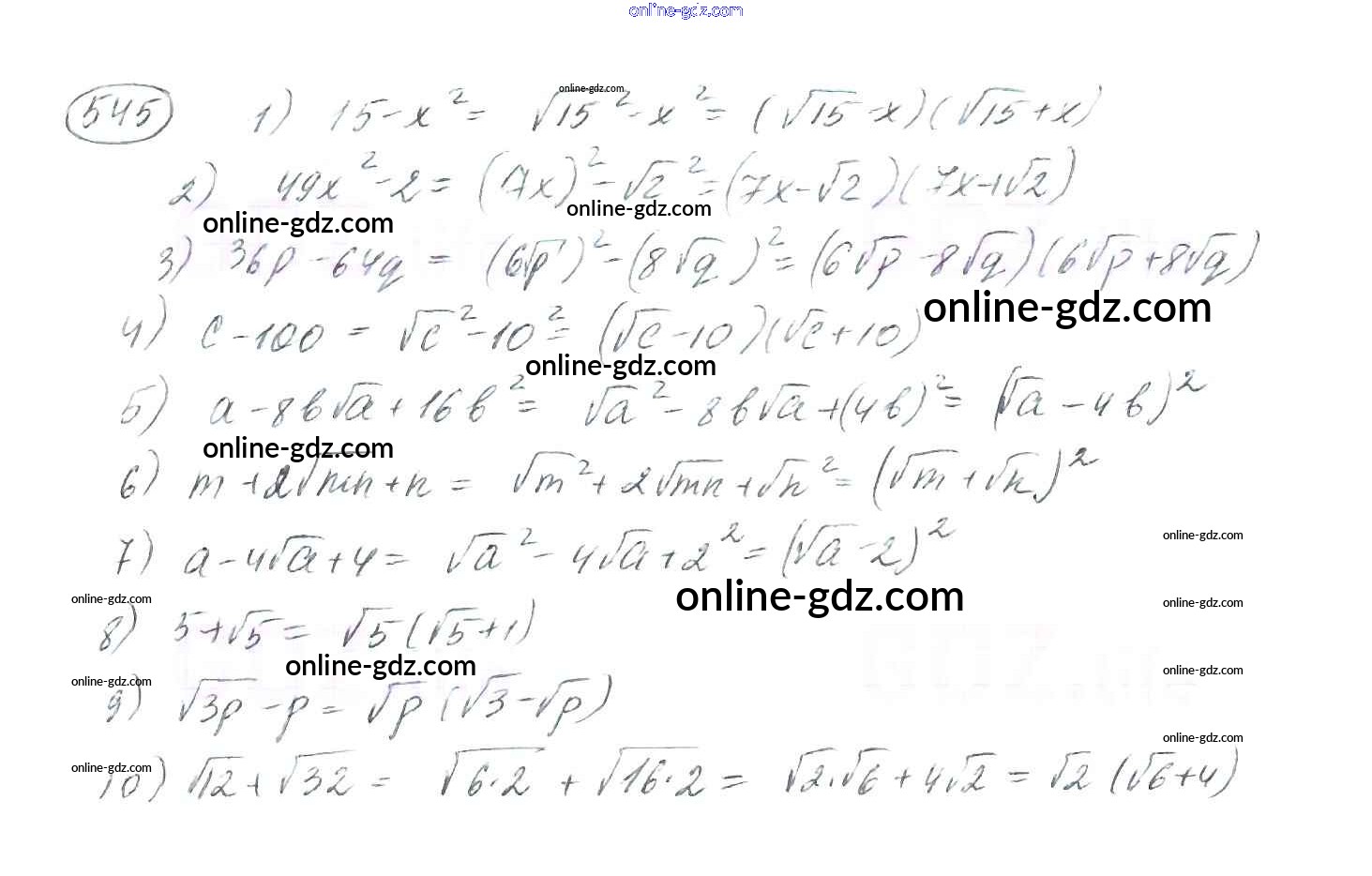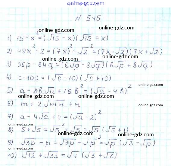 Готовые домашние задания по Алгебре за 8 класс Учебник Мерзляк, Полонский Алгоритм успеха 2016 - §17. Тождественные преобразования выражений, содержащих арифметические квадратные корни Глава 2. Квадратные корни. Действительные числа 545
