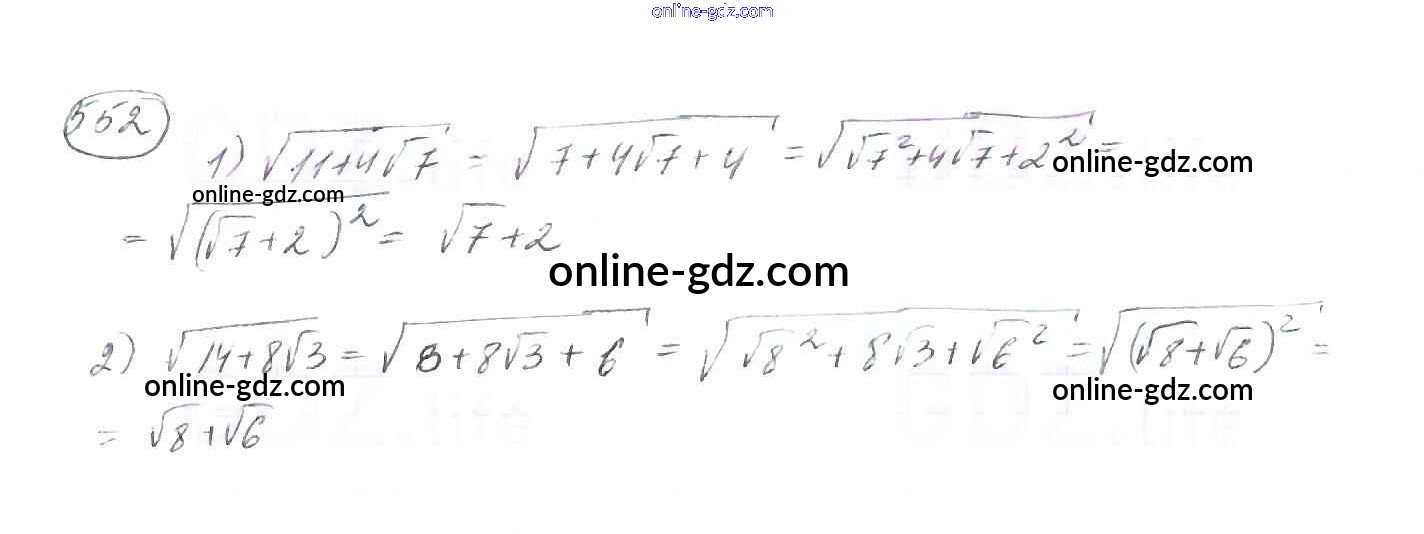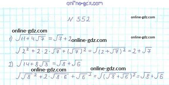 Готовые домашние задания по Алгебре за 8 класс Учебник Мерзляк, Полонский Алгоритм успеха 2016 - §17. Тождественные преобразования выражений, содержащих арифметические квадратные корни Глава 2. Квадратные корни. Действительные числа 552