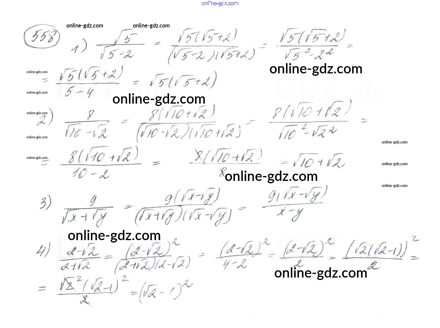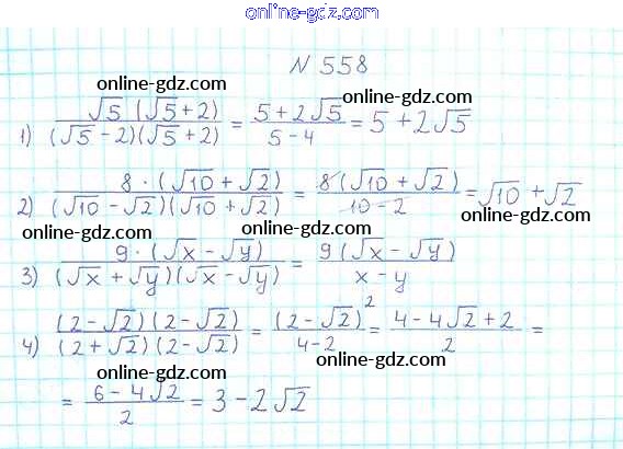 Готовые домашние задания по Алгебре за 8 класс Учебник Мерзляк, Полонский Алгоритм успеха 2016 - §17. Тождественные преобразования выражений, содержащих арифметические квадратные корни Глава 2. Квадратные корни. Действительные числа 558