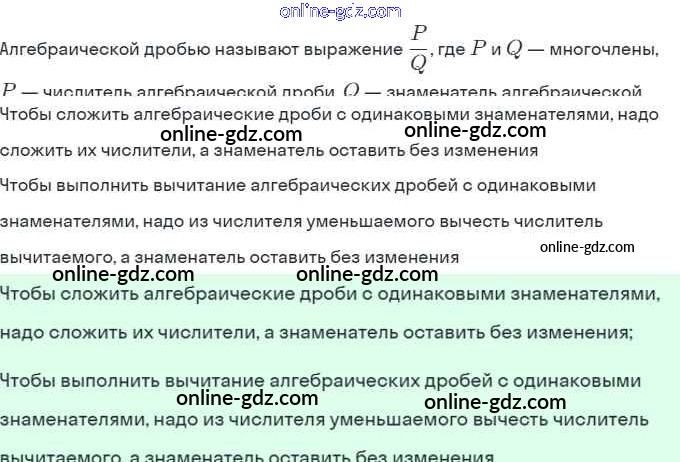 Готовые домашние задания по Алгебре за 8 класс Учебник Мордкович Базовый уровень 2017 - §3. Сложение и вычитание алгебраических дробей с одинаковыми знаменателями 1