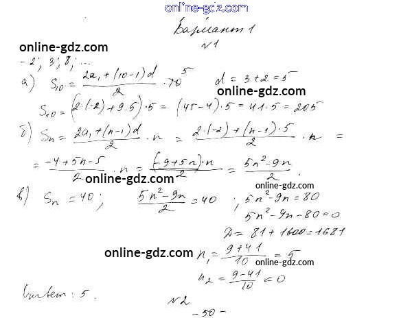 Готовые домашние задания по Алгебре за 9 класс Дидактические материалы Евстафьева, Карп 2017 - П-44. Сумма первых п членов арифметической прогрессии Проверочные работы Вариант 1