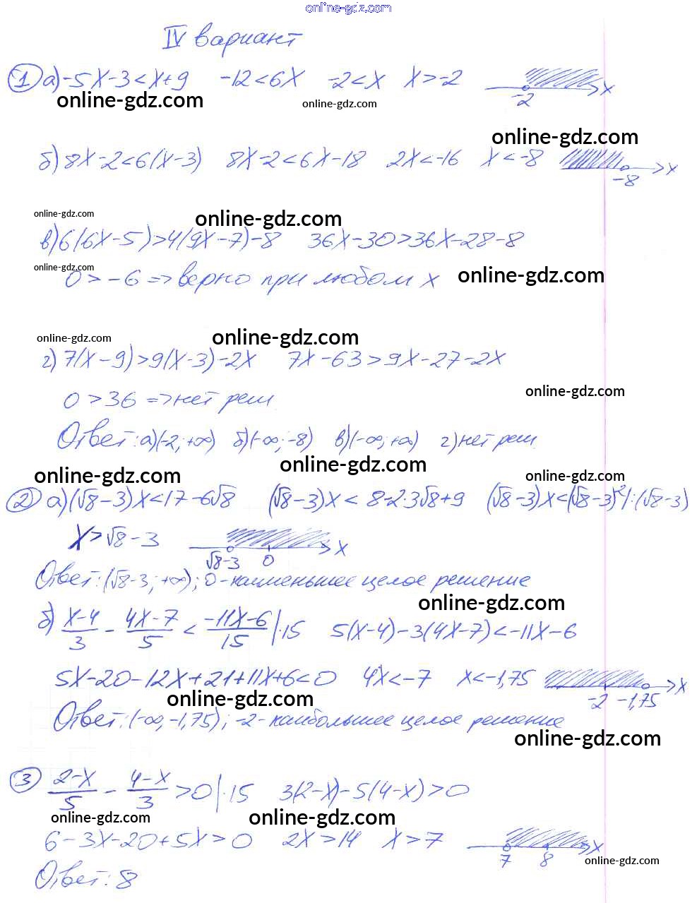 Готовые домашние задания по Алгебре за 9 класс Дидактические материалы Потапов, Шевкин МГУ - школе 2010 - СР №1. Линейные неравенства с одним неизвестным Самостоятельные работы вариант 4