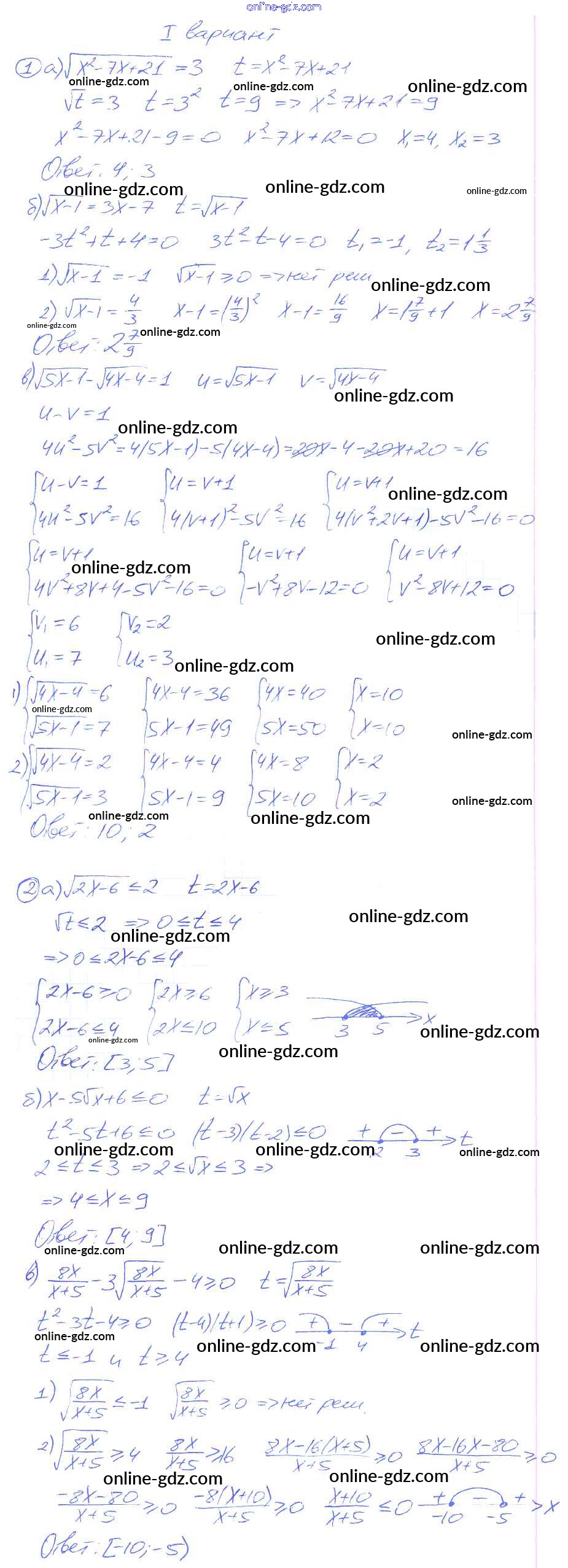 Готовые домашние задания по Алгебре за 9 класс Дидактические материалы Потапов, Шевкин МГУ - школе 2010 - СР №13. Замена неизвестного при решении иррациональных уравнений и неравенств Самостоятельные работы вариант 1