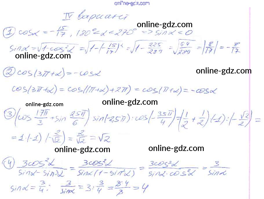 Готовые домашние задания по Алгебре за 9 класс Дидактические материалы Потапов, Шевкин МГУ - школе 2010 - СР №24. Формулы для синуса и косинуса угла Самостоятельные работы вариант 4