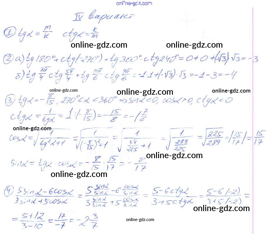Готовые домашние задания по Алгебре за 9 класс Дидактические материалы Потапов, Шевкин МГУ - школе 2010 - СР №25. Тангенс и котангенс угла Самостоятельные работы вариант 4