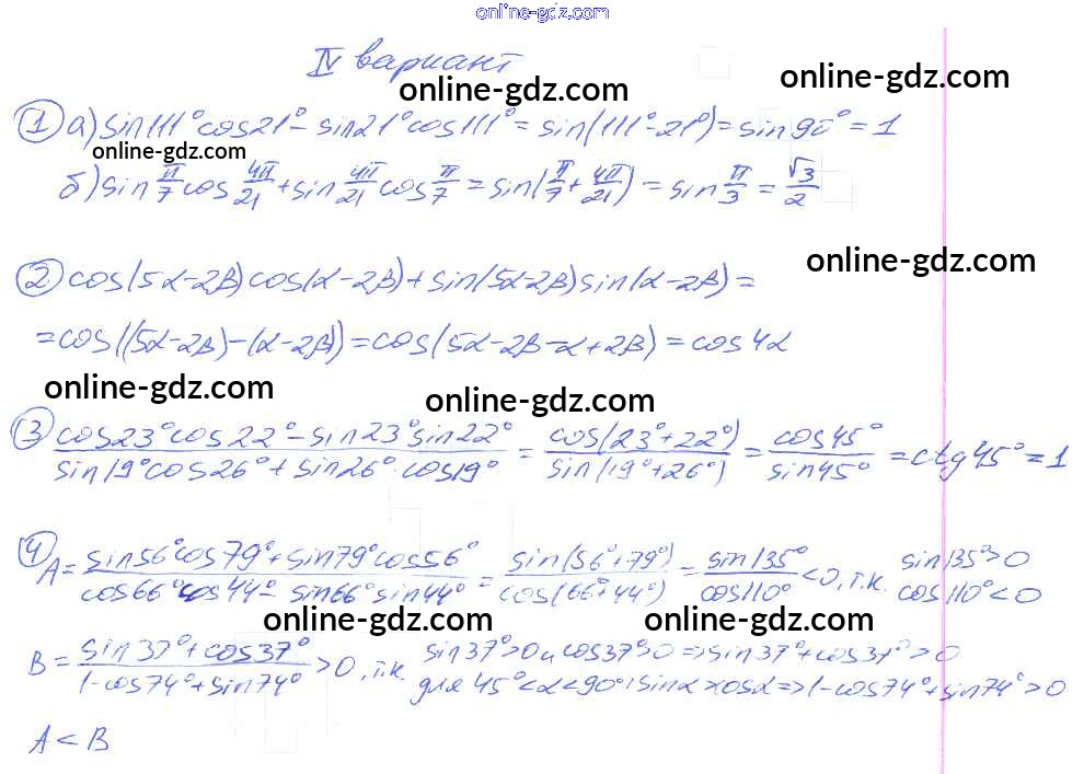 Готовые домашние задания по Алгебре за 9 класс Дидактические материалы Потапов, Шевкин МГУ - школе 2010 - СР №26. Косинус суммы и косинус разности двух углов. Синус суммы и синус разности двух углов Самостоятельные работы вариант 4