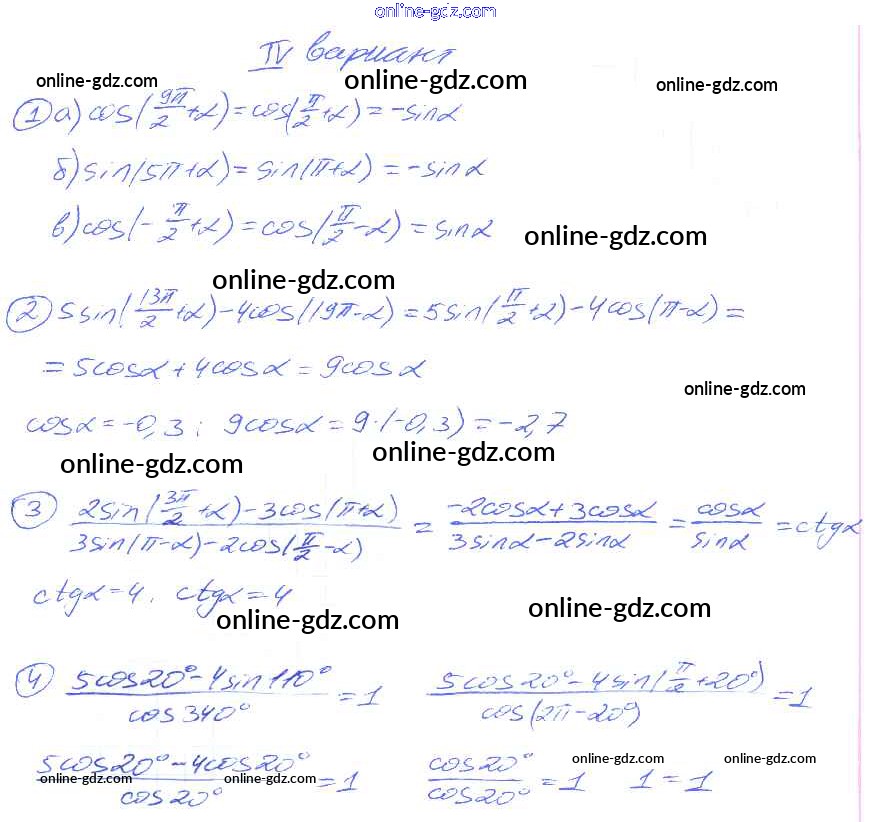 Готовые домашние задания по Алгебре за 9 класс Дидактические материалы Потапов, Шевкин МГУ - школе 2010 - СР №27. Формулы приведения для синуса и косинуса Самостоятельные работы вариант 4