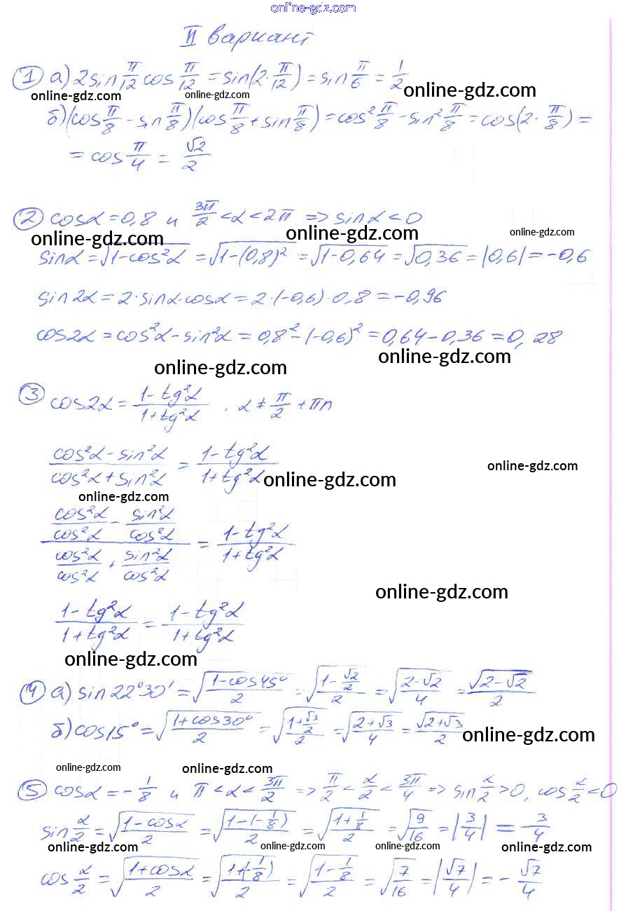 Готовые домашние задания по Алгебре за 9 класс Дидактические материалы Потапов, Шевкин МГУ - школе 2010 - СР №29. Формулы для двойных и половинных углов Самостоятельные работы вариант 2
