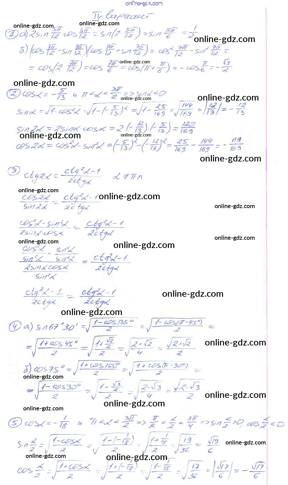 Готовые домашние задания по Алгебре за 9 класс Дидактические материалы Потапов, Шевкин МГУ - школе 2010 - СР №29. Формулы для двойных и половинных углов Самостоятельные работы вариант 4