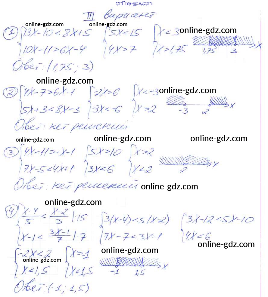 Готовые домашние задания по Алгебре за 9 класс Дидактические материалы Потапов, Шевкин МГУ - школе 2010 - СР №3. Системы линейных неравенств с одним неизвестным Самостоятельные работы вариант 3