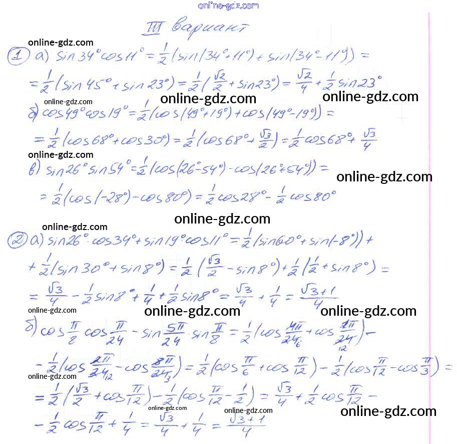Готовые домашние задания по Алгебре за 9 класс Дидактические материалы Потапов, Шевкин МГУ - школе 2010 - СР №30. Произведения синусов и косинусов Самостоятельные работы вариант 3