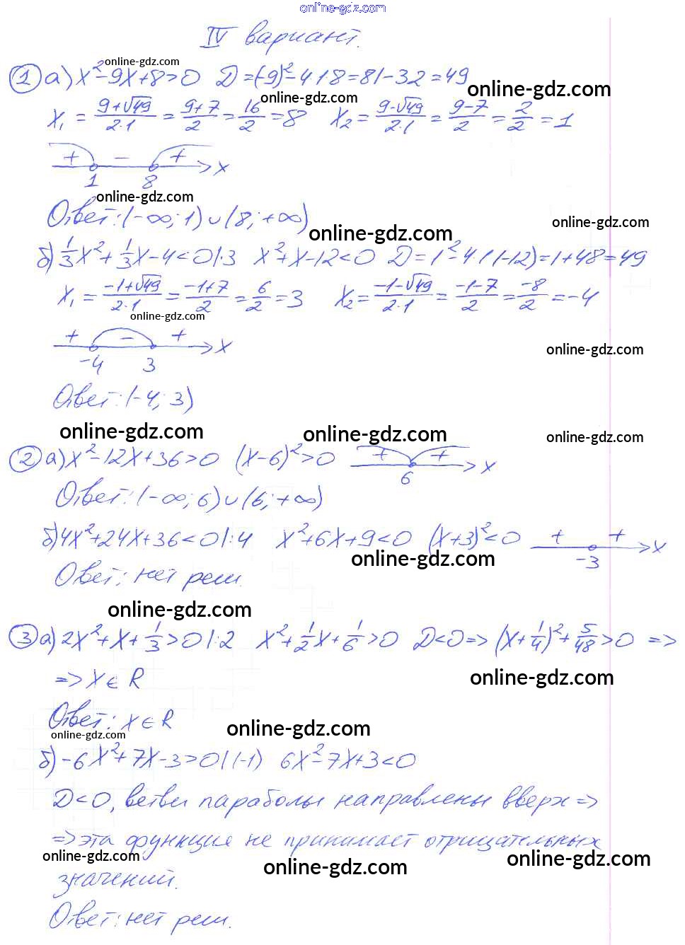 Готовые домашние задания по Алгебре за 9 класс Дидактические материалы Потапов, Шевкин МГУ - школе 2010 - СР №5. Неравенства второй степени Самостоятельные работы вариант 4
