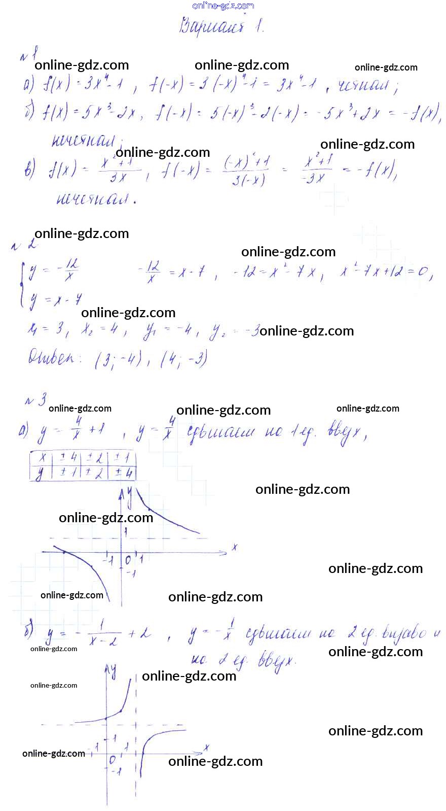 Готовые домашние задания по Алгебре за 9 класс Дидактические материалы Зив, Гольдич 2013 - СР-10. Четность и нечетность функции. Функция у = k делить на х Самостоятельные работы вариант 1