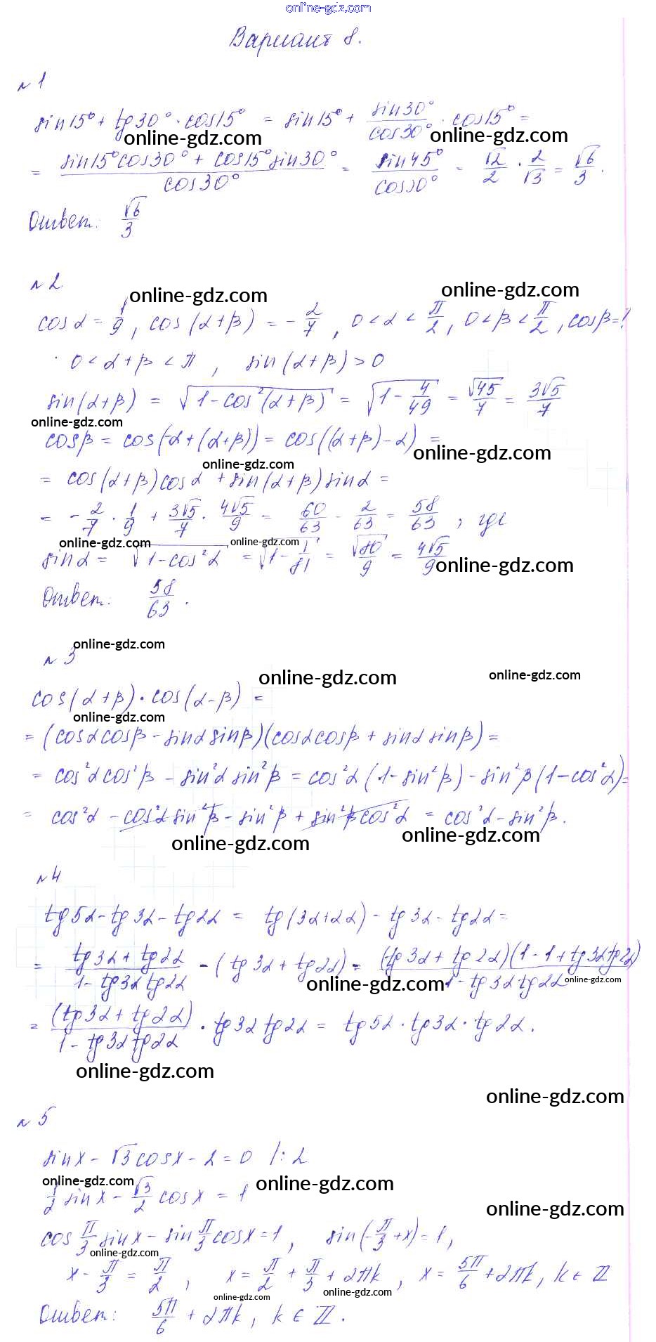 Готовые домашние задания по Алгебре за 9 класс Дидактические материалы Зив, Гольдич 2013 - СР-14. Формулы сложения Самостоятельные работы вариант 8