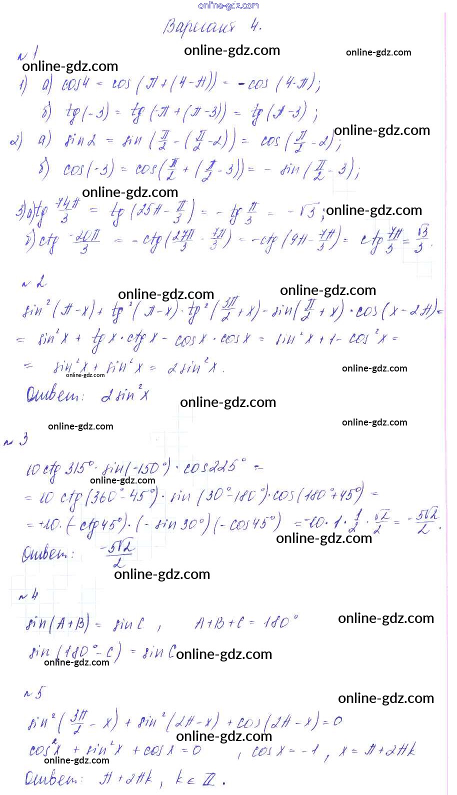 Готовые домашние задания по Алгебре за 9 класс Дидактические материалы Зив, Гольдич 2013 - СР-16. Формулы приведения Самостоятельные работы вариант 4