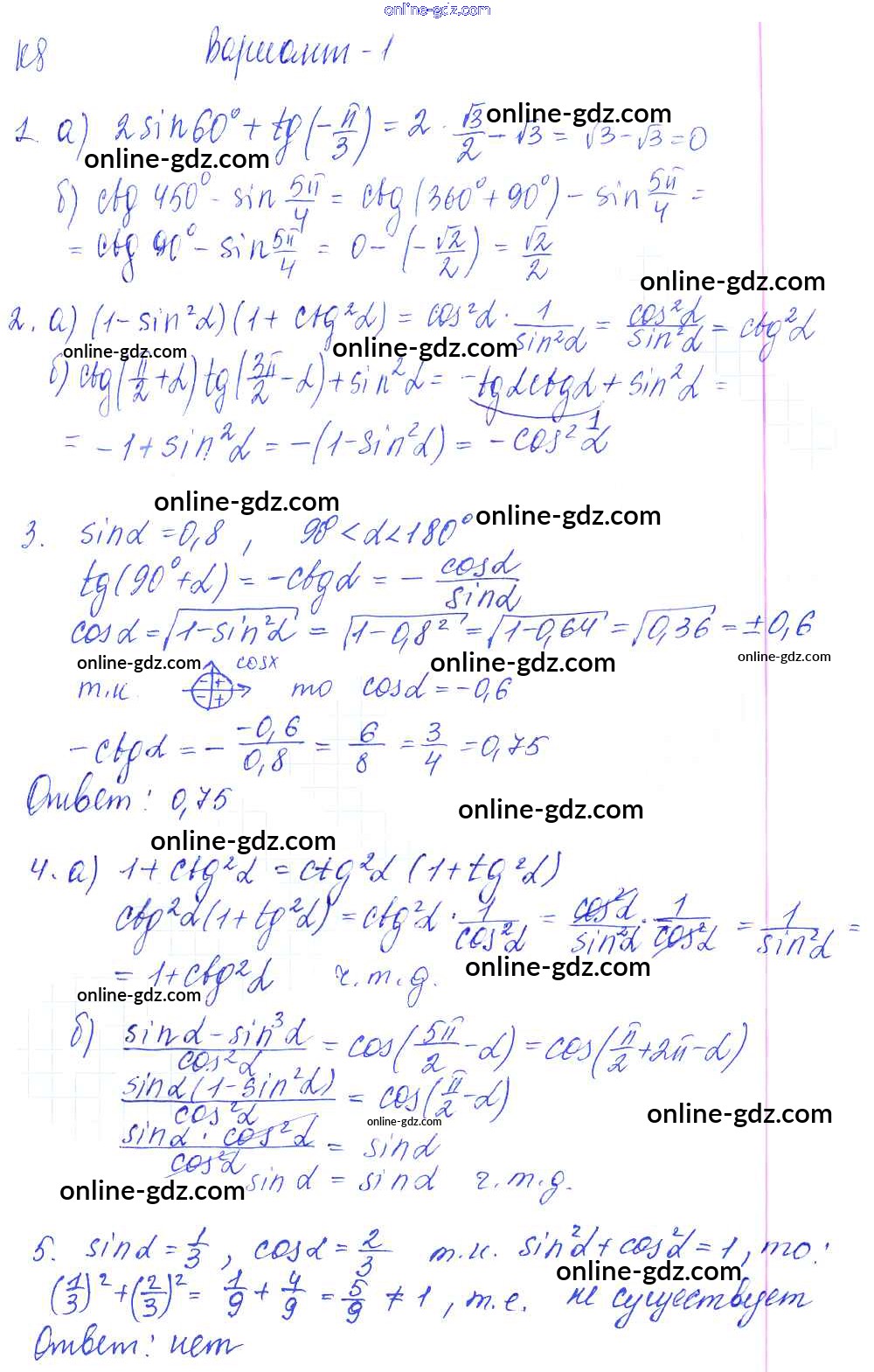 Готовые домашние задания по Алгебре за 9 класс Контрольные и самостоятельные работы Журавлев, Малышева УМК 2016 - К-8. Свойства тригонометрических функций. Тригонометрические тождества. Формулы приведения Контрольные работы Вариант №1