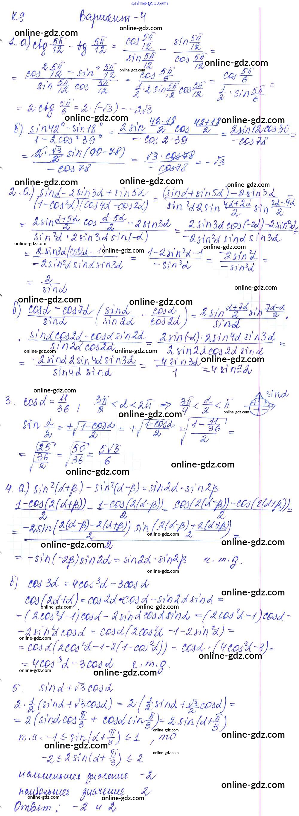 Готовые домашние задания по Алгебре за 9 класс Контрольные и самостоятельные работы Журавлев, Малышева УМК 2016 - К-9. Формулы сложения и их следствия Контрольные работы Вариант №4