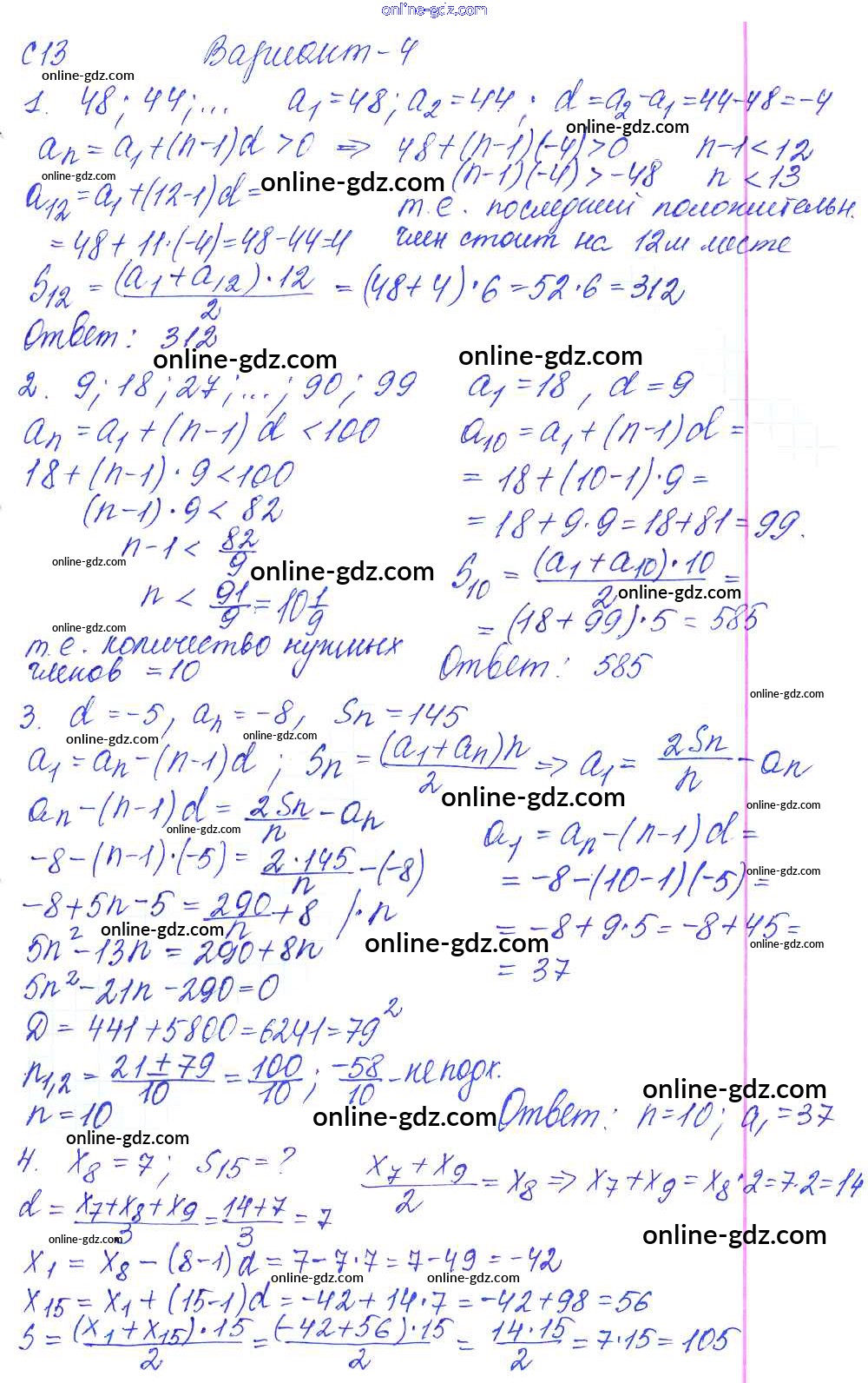 Готовые домашние задания по Алгебре за 9 класс Контрольные и самостоятельные работы Журавлев, Малышева УМК 2016 - С-13. Формула суммы n первых членов арифметической прогрессии Самостоятельные работы Вариант №4