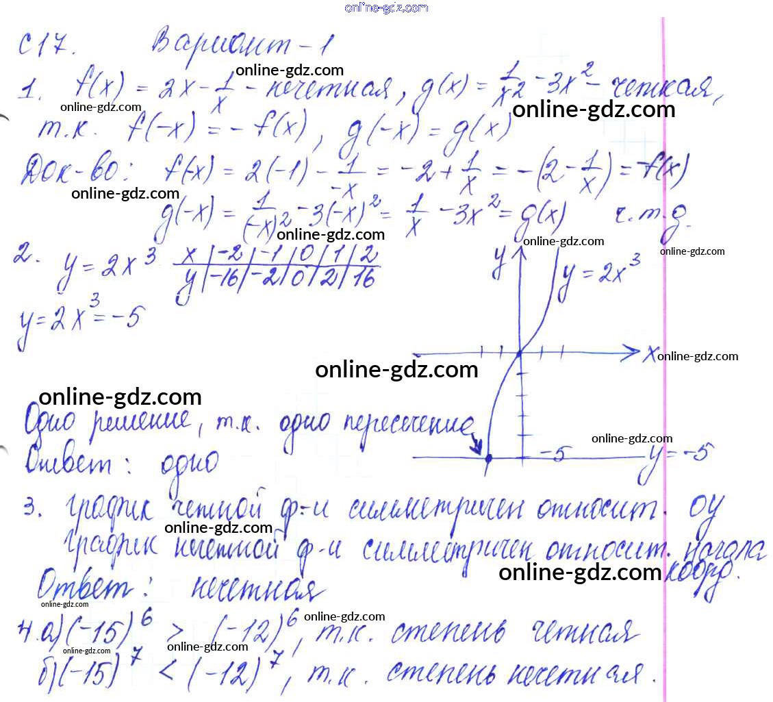 Готовые домашние задания по Алгебре за 9 класс Контрольные и самостоятельные работы Журавлев, Малышева УМК 2016 - С-17. Четные и нечетные функции. Функция у = хn Самостоятельные работы Вариант №1