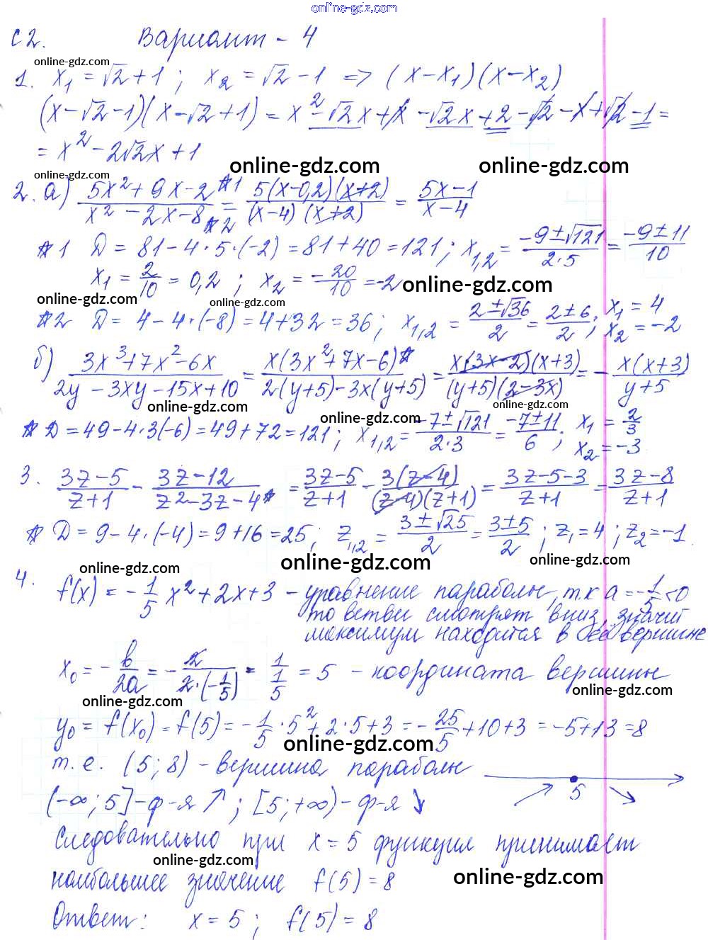 Готовые домашние задания по Алгебре за 9 класс Контрольные и самостоятельные работы Журавлев, Малышева УМК 2016 - С-2. Квадратный трехчлен Самостоятельные работы Вариант №4