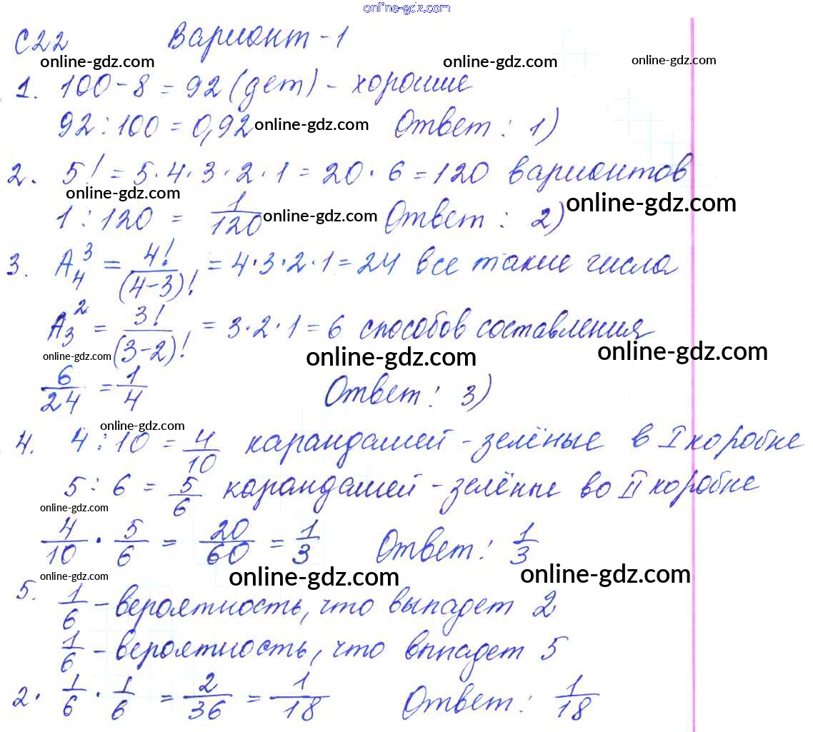 Готовые домашние задания по Алгебре за 9 класс Контрольные и самостоятельные работы Журавлев, Малышева УМК 2016 - С-22. Начальные сведения из теории вероятностей Самостоятельные работы Вариант №1